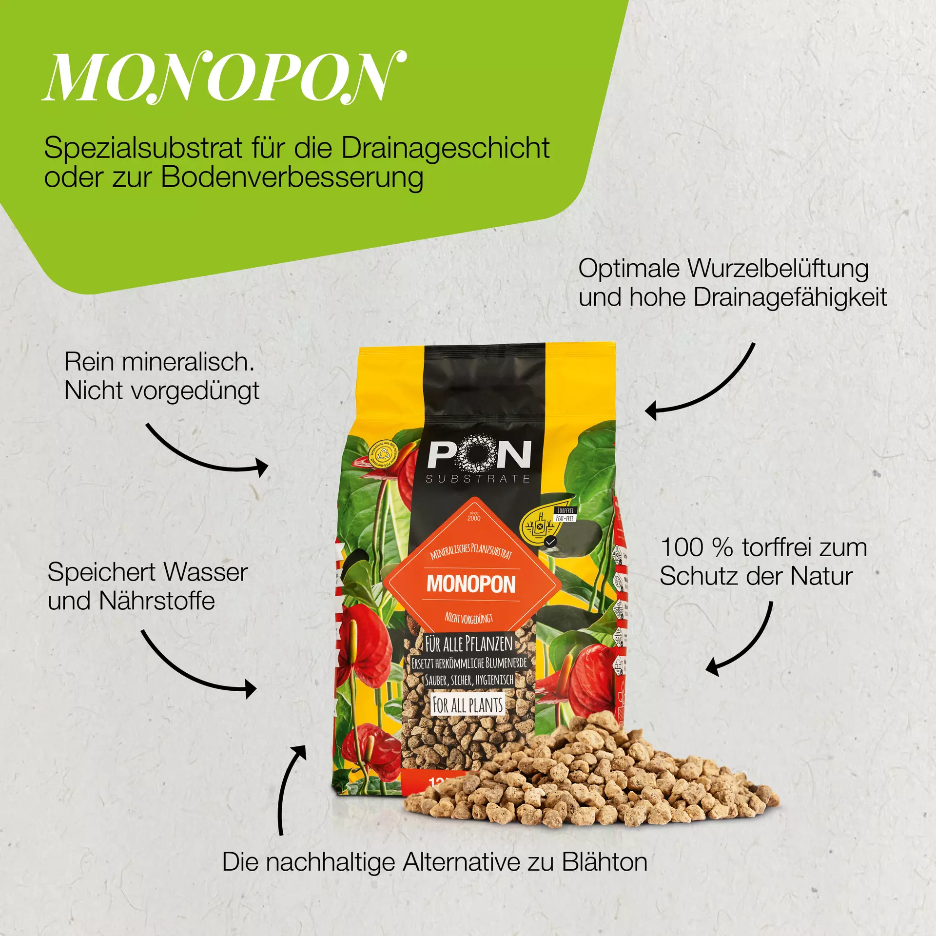 Dėl 100 % natūralios pemzos jis sulaiko drėgmę ir taip pat patikimai ją atiduoda. Be to, kad naudojamas kaip drenažo sluoksnis, MONOPON taip pat gali būti maišomas su dirvožemiu, kad jį supurentų ir aeruotų, taip išvengiant sutankėjimo. Tai taip pat puiki alternatyva įprastiems keramzitbetonio akmenukams, kurie išskiria didelį CO₂ pėdsaką. Netręšta formulė leidžia augalus tręšti pagal poreikį arba derinti su iš anksto patręštu substratu.