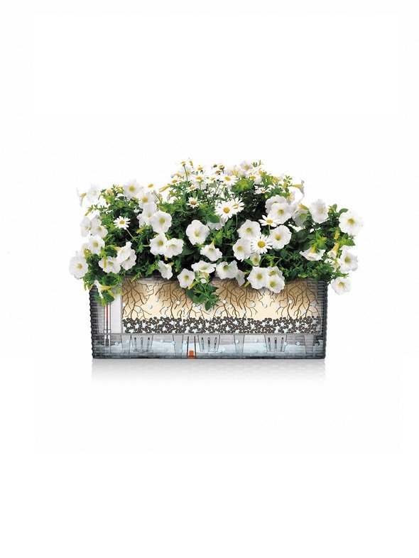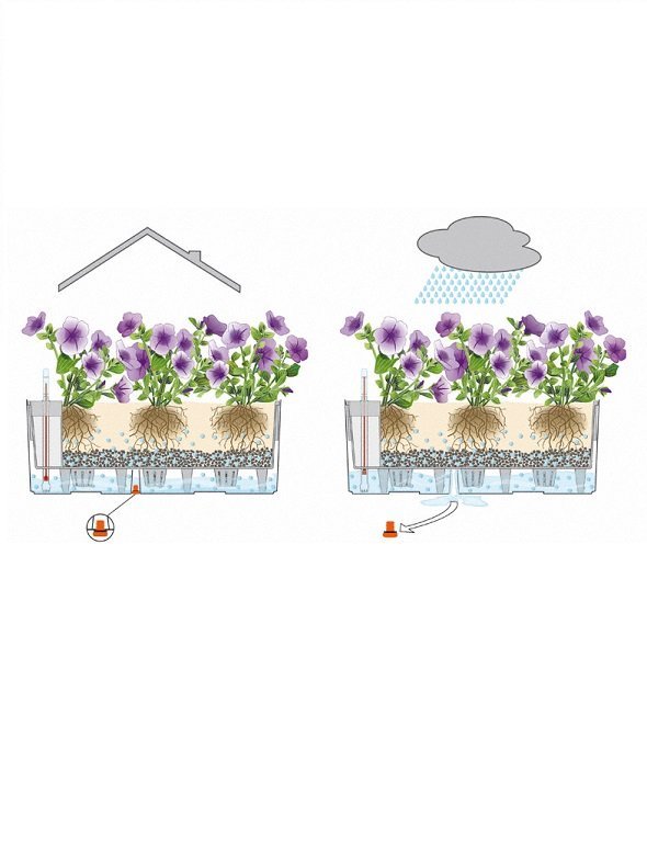 Integruota laistymo sistema su vandens rezervuaru pasirūpina, kad augalai visada gautų pakankamai drėgmės – net ir karštomis vasaros dienomis. Lietingomis dienomis perteklinis vanduo lengvai nuteka – tereikia atsukti perpildymo varžtą.