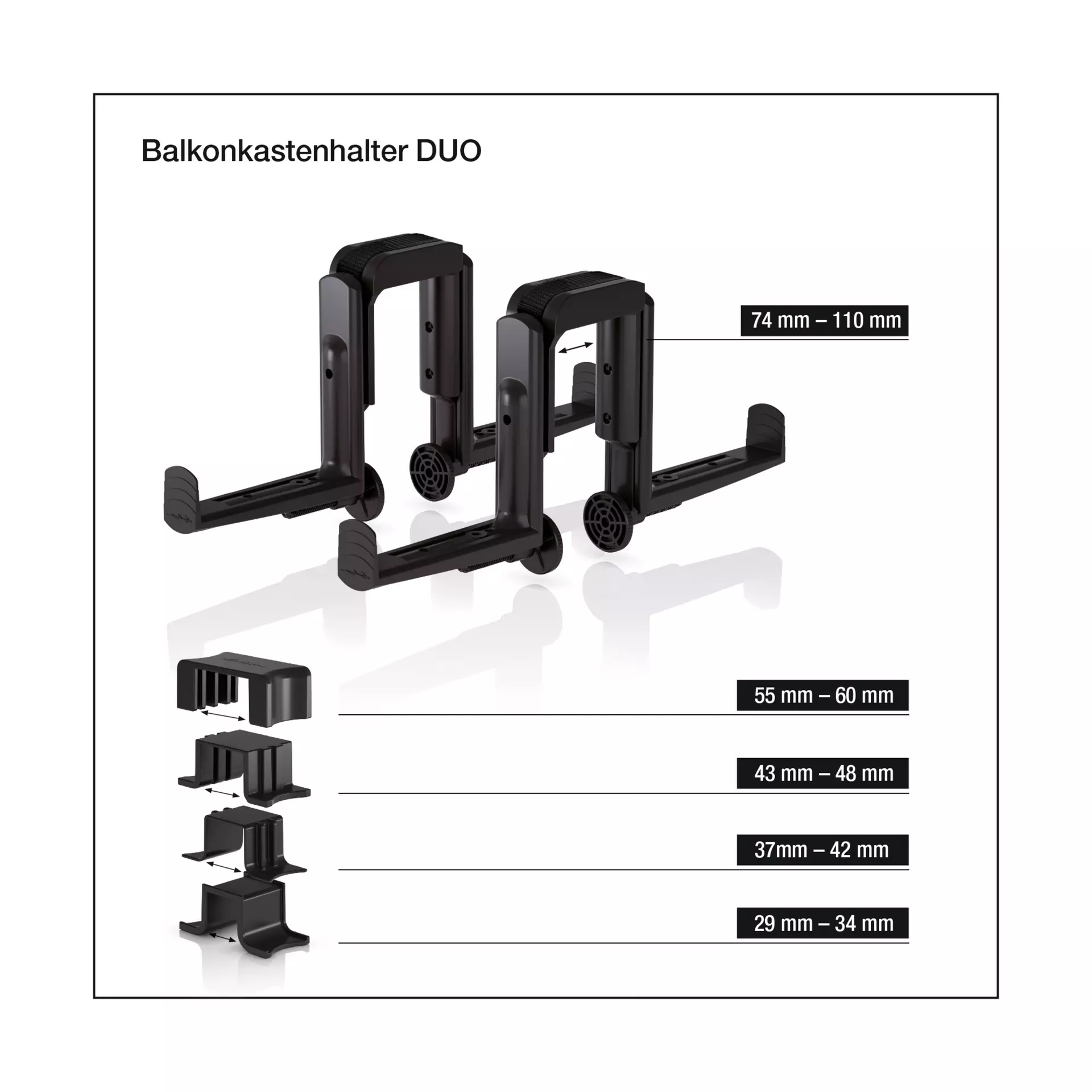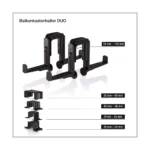 Į komplektą įeina 2 laikikliai DUO (1 pora) su atitinkamu 4 dalių adapterių rinkiniu balkono turėklams. Tinka visiems BALCONERA dydžiams.