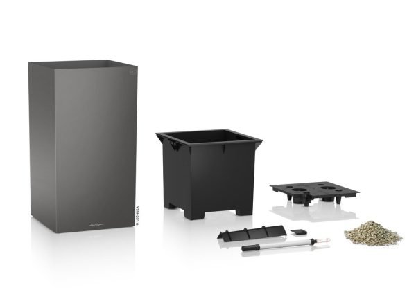 Išorinis vazonas + vidinis vazonas + indikatorius + substratas + substratui nuo vandens atskyrimui grotelės