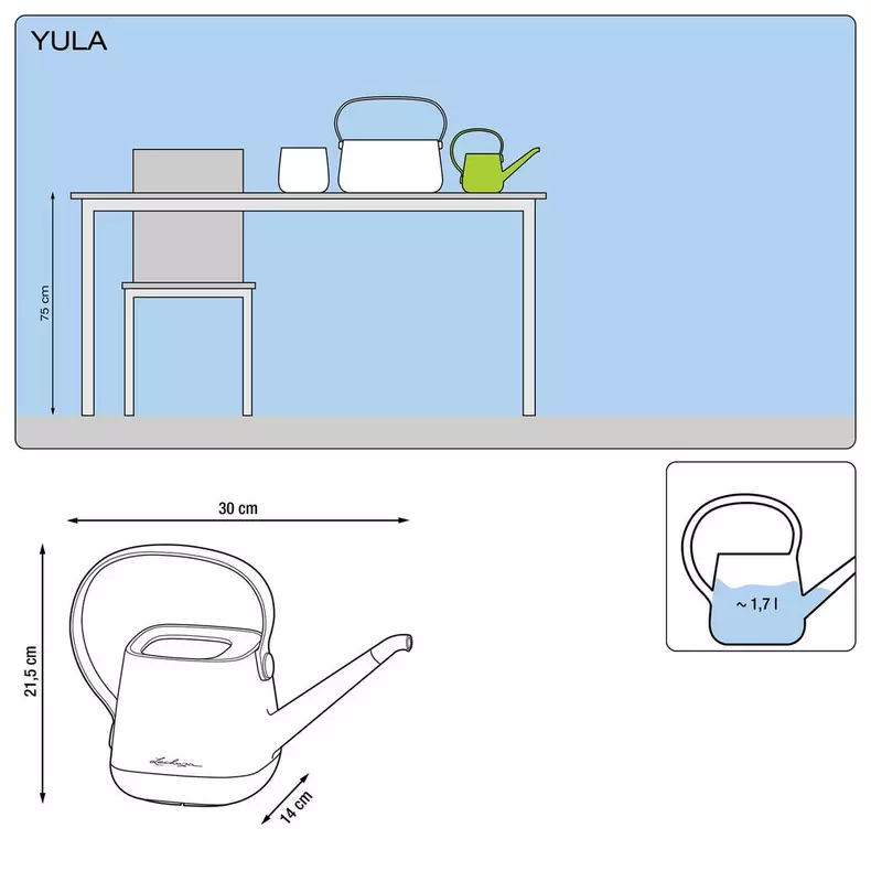 Harmoningos pastelinės spalvos, matiniai paviršiai ir švarios formos suteikia interjerui subtilaus žavesio, o 1,7 litro talpos YULA laistytuvė tampa ne tik praktišku, bet ir stilingu aksesuaru jūsų namuose.
