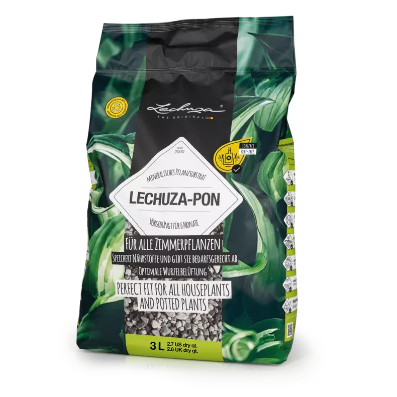 Mineralinis sodinimo substratas LECHUZA-PON yra originalios LECHUZA savaiminio laistymo sistemos širdis. Jis užtikrina augalams optimalią šaknų aeraciją ir veikia kaip vandens bei maistinių medžiagų rezervuaras, kurios prireikus atpalaiduojamos atgal augalams. Dėl puikių mineralinio substrato drenažo savybių išvengiama užmirkimo.