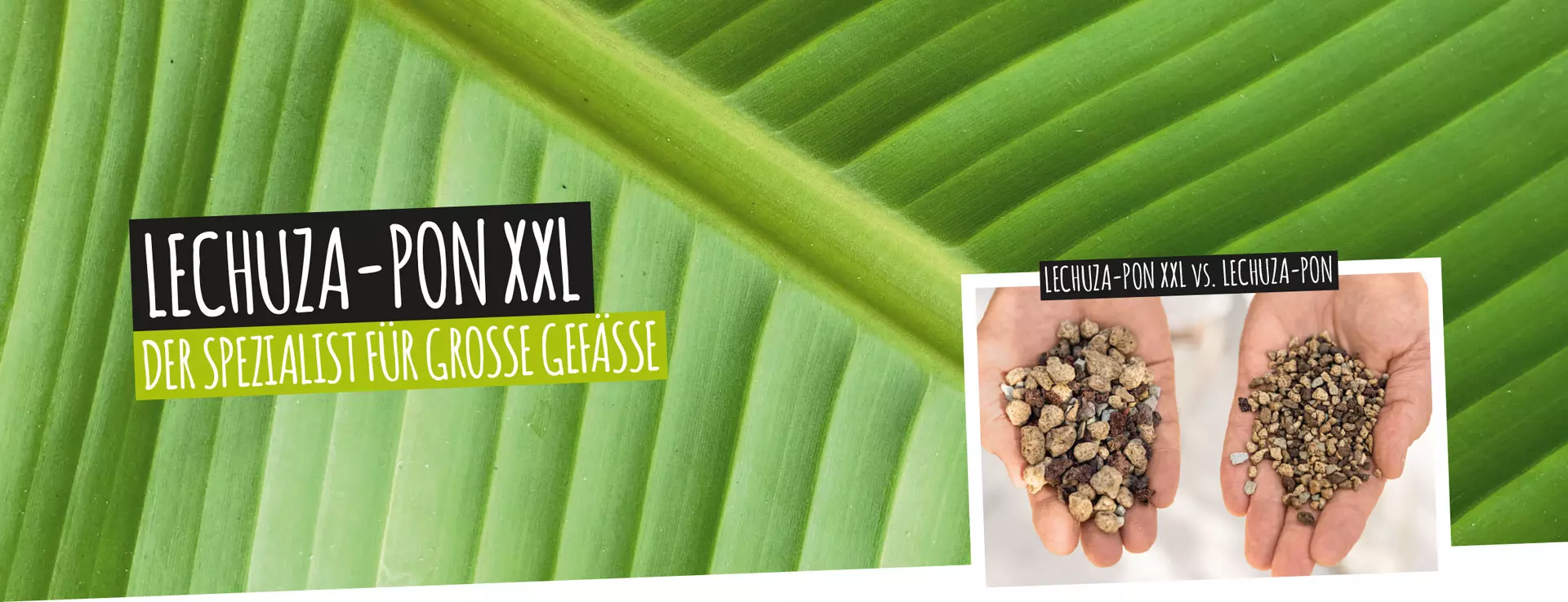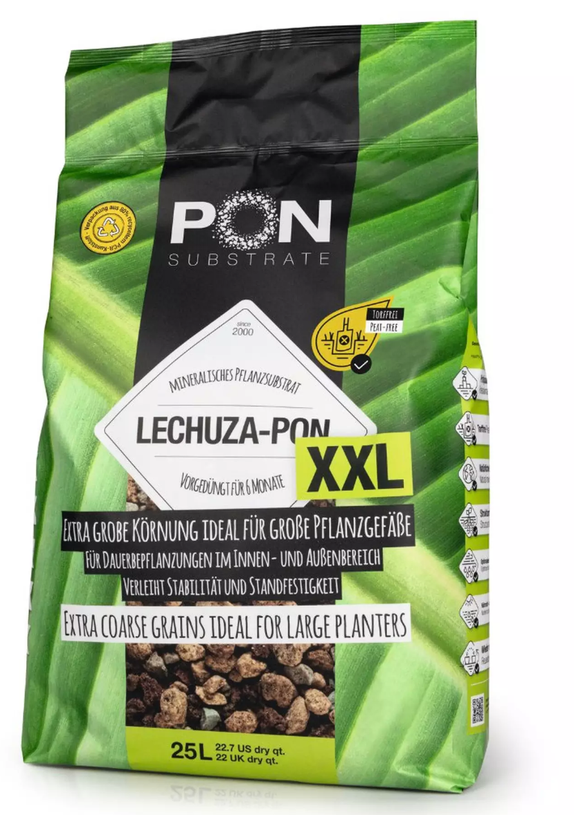 Ypač šiurkštus , grynai mineralinis sodinimo substratas LECHUZA-PON XXL puikiai tinka dideliems sodintojams ir suteikia didesniems vazoniniams augalams reikiamą stabilumą. Dėl didelio matmenų stabilumo substratas nesuspaudžiamas ir išlaiko savo orinę struktūrą. Šis mineralinis substratas sudarytas iš pemzos, lavos ir ceolito, kurie veikia kaip vandens ir maistinių medžiagų rezervuarai, išskirdami jas augalui pagal poreikį. Struktūriškai stabili sudėtis apsaugo nuo užmirkimo ir šaknų puvinio.