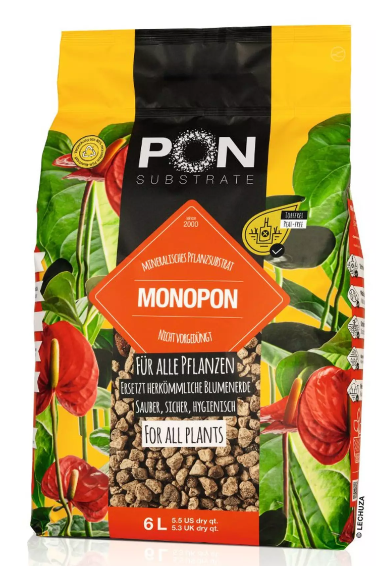Grynai mineralinis substratas MONOPON sudarytas iš 100 % natūralios pemzos ir, kaip drenažo sluoksnis įprastuose augalų vazonuose be LECHUZA savaiminio laistymo sistemos, užtikrina optimalią šaknų aeraciją ir pakankamą oro cirkuliaciją vazono viduje. Kaip ekologiška alternatyva keramzitbetonio akmenukams, MONOPON sudaro pirmąjį sluoksnį vazone ir apsaugo nuo užmirkimo bei šaknų puvinio. Natūrali pemza sulaiko drėgmę ir, jei reikia, atiduoda ją atgal į šaknis. MONOPON gali būti naudojamas visam sodinimui vietoj įprasto vazoninio dirvožemio. Be to, kad naudojamas kaip drenažo sluoksnis, MONOPON taip pat gali būti maišomas su vazoniniu dirvožemiu, kad dirvožemis būtų puresnis ir aeruojamas. Substratas nėra iš anksto tręšiamas, kad būtų užtikrintas pakankamas maistinių medžiagų tiekimas, todėl jis universaliai tinka visiems augalams.